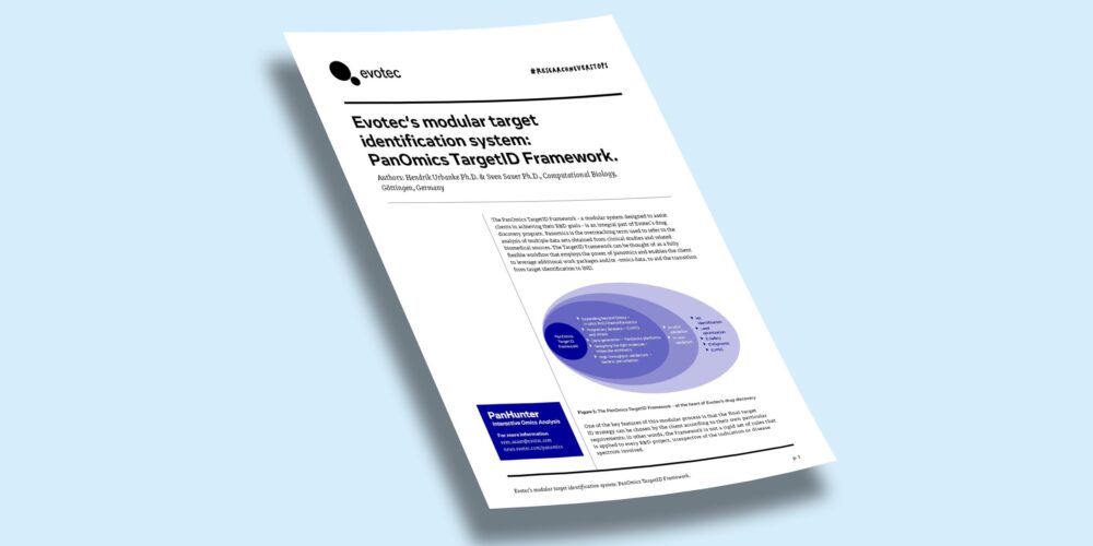 Target identification is a fundamental first step in drug discovery, involving the discovery and validation of disease-associated molecular mechanism that can be modulated by a drug. In this whitepaper we introduce Evotec’s PanOmics TargetID Framework developed by the Bioinformatics and Computational Biology teams. It is a modular system that uses computational tools coupled with expert assessments to identify and rank potential drug targets. Our framework delivers a comprehensive report with a list of disease-relevant targets, their scores, annotations, rankings, and detailed information on their draggability, biology, safety, competition, and efficacy.