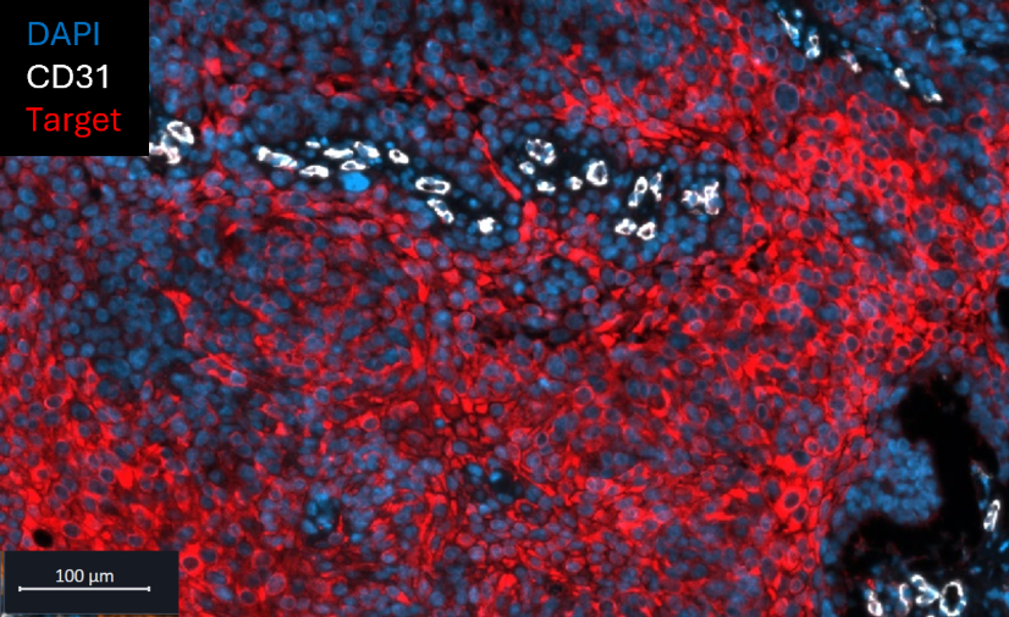 Figure 2. Double-IF of human squamous cell carcinoma, where target expression (red) intensifies with increasing distance from CD31-positive tumor blood vessels (white).